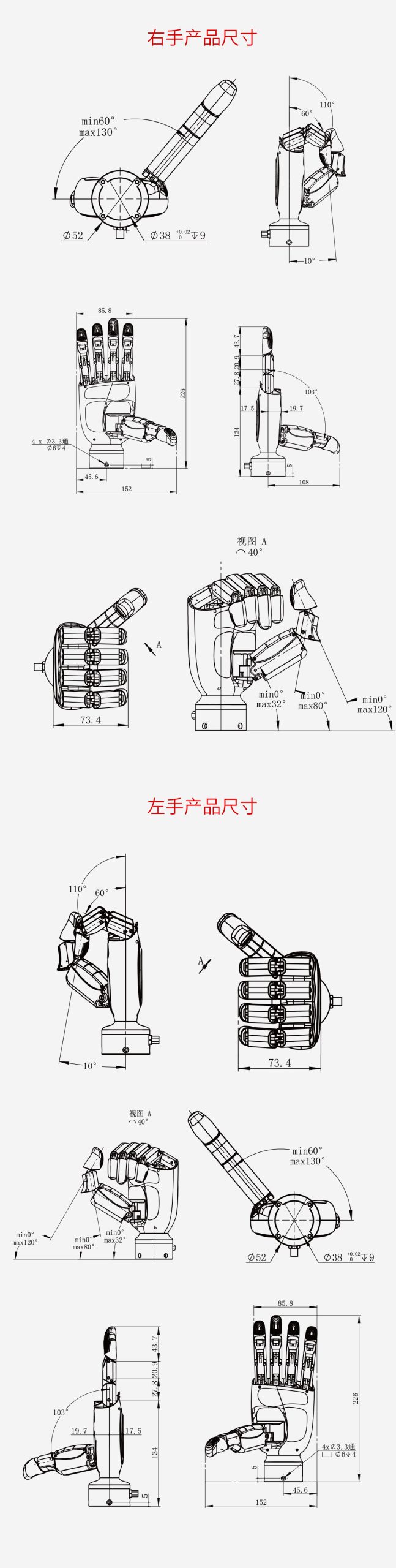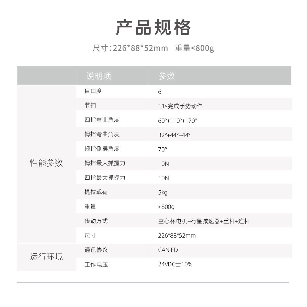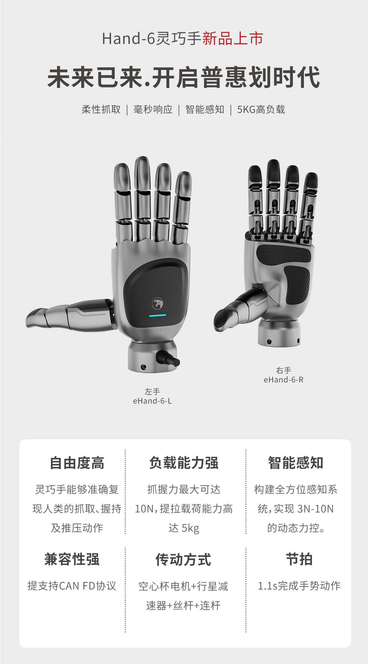 2025年5月13日 pruce 靈巧手, 電動夾爪 0 eHand-6 首頁 / 電動夾爪 / eHand-6 播放視頻 自由度:精準復刻人類抓、捏、握、推動作 負載能力:抓握力最大可達10N,提拉載荷能力高達5kg 毫秒級響應:1.1s完成復雜手勢,速度與穩定性兼得 智能感知:可選配5通道觸覺反饋傳感器 開發兼容性:提供Python/ROS雙API接口 下載3D模型 下載產品手冊 播放視頻 自由度:精準復刻人類抓、捏、握、推動作 負載能力:抓握力最大可達10N,提拉載荷能力高達5kg 毫秒級響應:1.1s完成復雜手勢,速度與穩定性兼得 智能感知:可選配5通道觸覺反饋傳感器 開發兼容性:提供Python/ROS雙API接口 下載3D模型 下載產品手冊 產品描述 資料下載 產品描述 eHand-6 核心參數?61.1s自由度節拍10N10N拇指最大抓握力四指最大抓握力5kg小于800g提拉載荷本體重量*安裝尺寸圖規格參數?詳情產品型號eHand-6自由度6節拍1.1s完成手勢動作四指彎曲角度60°+110°+170°拇指彎曲角度32°+44°+44°拇指側擺角度70°拇指最大抓握力10N四指最大抓握力10N提拉載荷5kg重量<800g傳動方式空心杯電機+行星減速機+絲桿+連桿尺寸220*88*52mm通訊協議CAN FD工作電壓24VDC±10%備注:由于產品不斷推新迭代,產品參數如有變更,恕不另行通知。 資料下載 點擊下載產品手冊點擊下載3D圖點擊下載運動范圍圖 eHand-6 核心參數 產品詳細參數 產品型號eHand-6自由度6節拍1.1s完成手勢動作四指彎曲角度60°+110°+170°拇指彎曲角度32°+44°+44°拇指側擺角度70°拇指最大抓握力10N四指最大抓握力10N提拉載荷5kg重量<800g傳動方式空心杯電機+行星減速機+絲桿+連桿尺寸220*88*52mm通訊協議CAN FD工作電壓24VDC±10%備注:由于產品不斷推新迭代,產品參數如有變更,恕不另行通知。 產品詳情 相關產品