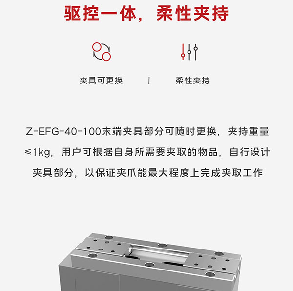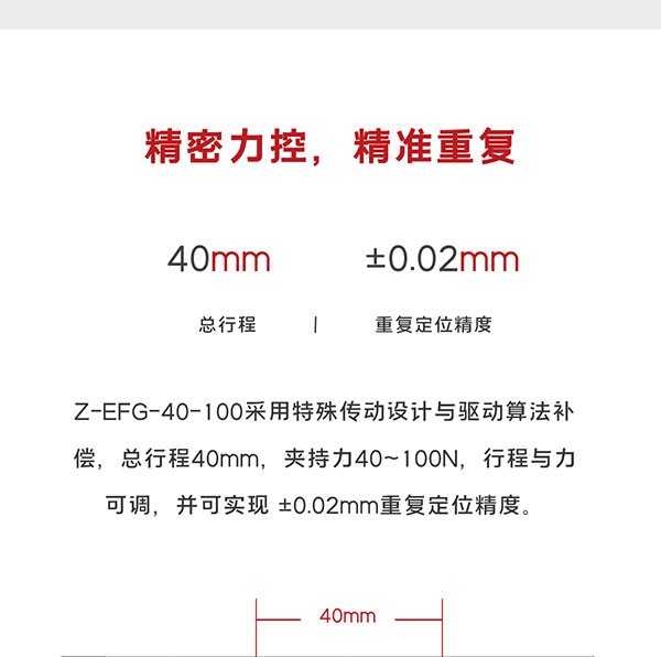 Z-EFG-40-100采用特殊傳動設(shè)計與驅(qū)動算法補償,總行程40mm,夾持力40~100N,行程與力可調(diào),并可實現(xiàn)±0.02mm重復(fù)定位精度,快速響應(yīng), 又快又穩(wěn),適用于狹小的工作環(huán)境!