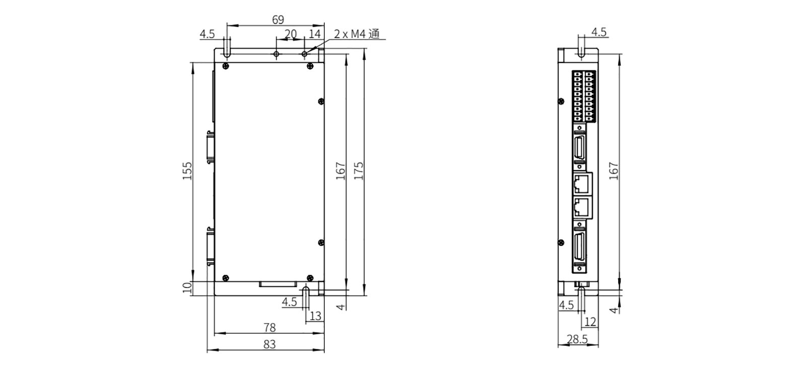2023年3月17日 Lu, DongWu 智能電缸 0 Z-Mod-DCIC-4 首頁 / 智能電缸 / Z-Mod-DCIC-4 雙軸驅(qū)動器自整定功能,簡單易上手兼容伺服電機(jī),音圈電機(jī)等力、位置、速度都可通過Modbus精準(zhǔn)控制控制方式:485、I/O、脈沖、Ethercat、CAN 下載3D模型 下載產(chǎn)品手冊 雙軸驅(qū)動器自整定功能,簡單易上手兼容伺服電機(jī),音圈電機(jī)等力、位置、速度都可通過Modbus精準(zhǔn)控制控制方式:485、I/O、脈沖、Ethercat、CAN 下載3D模型 下載產(chǎn)品手冊 產(chǎn)品描述 資料下載 產(chǎn)品描述 Z-Mod-DCIC-4 核心參數(shù) 雙軸 ? ? ? ? ? 40KPPS 控制軸數(shù) ? ? ? ? ? ? ? ?最大輸入脈沖頻率 0.4kg ? ? ? ?175*83*28.5mm 整機(jī)重量 ? ? ? ? ? ? ? ?? 尺寸規(guī)格 *線框尺寸圖 規(guī)格參數(shù) 型號性能 控制軸數(shù) 雙軸 電源電壓 DC24V±10% 額定電流 每個軸4A 控制方式 I/O控制、脈沖控制、485總線控制、EtherCat、CAN I/O接口 光耦隔離、8路輸入+8路輸出 最大輸入脈沖頻率 40KPPS 電纜最長長度 5m 整機(jī)重量 ?0.4kg 尺寸規(guī)格 0.072N·m 旋轉(zhuǎn)最大速度 175*83*28.5mm 防護(hù)等級 IP20 使用環(huán)境 0~40℃,85% RH以下(不結(jié)霜) 資料下載 點(diǎn)擊下載產(chǎn)品手冊 點(diǎn)擊下載3D圖 點(diǎn)擊下載運(yùn)動范圍圖 Z-Mod-DCIC-4 核心參數(shù) 最大輸入脈沖頻率:40KPPS電纜最長長度:5m尺寸規(guī)格:175*83*28.5mm 產(chǎn)品詳細(xì)參數(shù) 控制軸數(shù) 雙軸 電源電壓 DC24V±10% 額定電流 每個軸4A 控制方式 I/O控制、脈沖控制、485總線控制、EtherCat、CAN I/O接口 光耦隔離、8路輸入+8路輸出 最大輸入脈沖頻率 40KPPS 電纜最長長度 5m 整機(jī)重量 ?0.4kg 尺寸規(guī)格 0.072N·m 旋轉(zhuǎn)最大速度 175*83*28.5mm 防護(hù)等級 IP20 使用環(huán)境 0~40℃,85% RH以下(不結(jié)霜) 產(chǎn)品詳情 相關(guān)產(chǎn)品