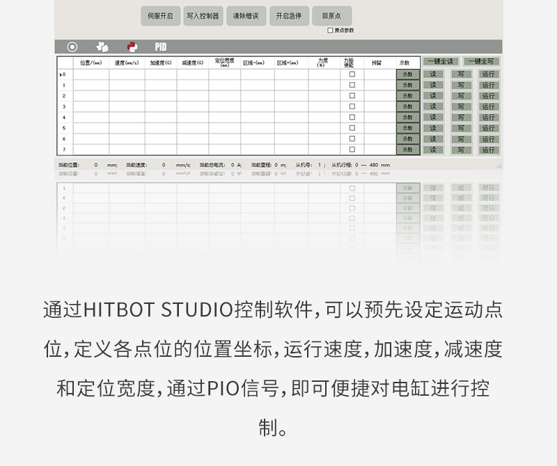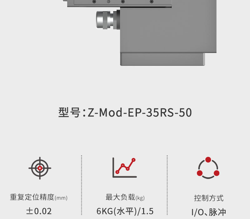 2023年1月10日 Lu, DongWu 智能電缸 0 Z-Mod-EP-35RS-50 首頁 / 智能電缸 / Z-Mod-EP-35RS-50 體積小、推力大 、高精度、性價比高驅動內置,簡單易操作末端抗彎能力強力、位置、速度都可以通過Modbus精準控制長壽命:千萬次循環,超越氣缸控制方式:485、I/O、脈沖 下載3D模型 下載產品手冊 體積小、推力大 、高精度、性價比高驅動內置,簡單易操作末端抗彎能力強力、位置、速度都可以通過Modbus精準控制長壽命:千萬次循環,超越氣缸控制方式:485、I/O、脈沖 下載3D模型 下載產品手冊 產品描述 資料下載 產品描述 Z-Mod-EP-35RS-50 核心參數 1-2mm 280N? 導程 最大連續推壓力 50mm ? ? ? ? ? ? ? ? ? ? ? ? ? ?±0.02mm 行程 ? ? ? ? ? ? ? ? ? ? ? ? ? ? ? ? ? ? ? ? ? ? ? ?重復定位精度 *線框尺寸圖 規格參數 型號性能 行程 50mm 導程 1mm 2mm 最大速度 50mm/s 100mm/s 最大連續推壓力 280 150N 最大負載質量 水平:6kg / 垂直:1.5kg 水平:3kg / 垂直:1.5kg 重復定位精度 ±0.02mm 力控精度 ±10% 推桿不旋轉精度 ±1.5° 推桿末端允許力矩 1N·m 整機重 0.8kg 尺寸規格 160*40*86mm 控制方式 I/O控制、485總線控制、脈沖控制(脈沖+方向) 工作電壓 DC24V±10% 額定電流 2A 峰值電流 6A 防護等級 IP40 使用環境 0~40℃,85% RH以下(不結霜) 資料下載 點擊下載產品手冊 點擊下載3D圖 點擊下載運動范圍圖 Z-Mod-EP-35RS-50核心參數 產品詳細參數 行程50mm導程1mm2mm最大速度50mm/s100mm/s最大連續推壓力280N150N最大負載質量水平:6kg / 垂直:1.5kg水平:3kg / 垂直:1.5kg重復定位精度±0.02mm力控精度±10%推桿不旋轉精度±1.5°推桿末端允許力矩1N·m整機重0.8kg尺寸規格160*40*86mm控制方式I/O控制、485總線控制、脈沖控制(脈沖+方向)工作電壓DC24V±10%額定電流2A峰值電流6A防護等級IP40使用環境0~40℃,85% RH以下(不結霜) 產品詳情 相關產品