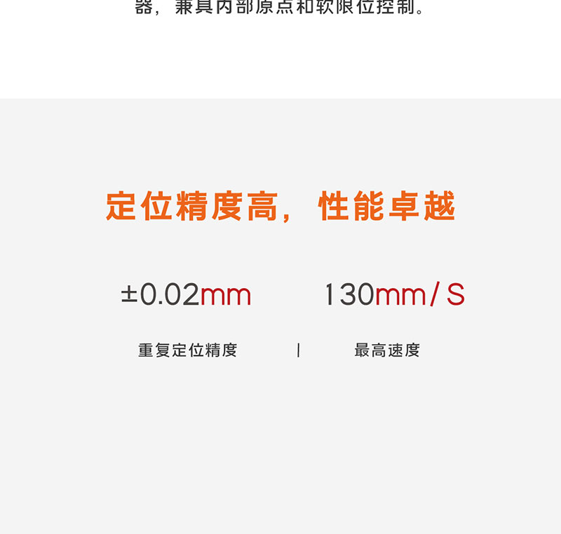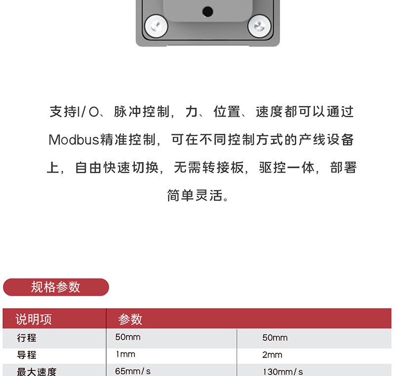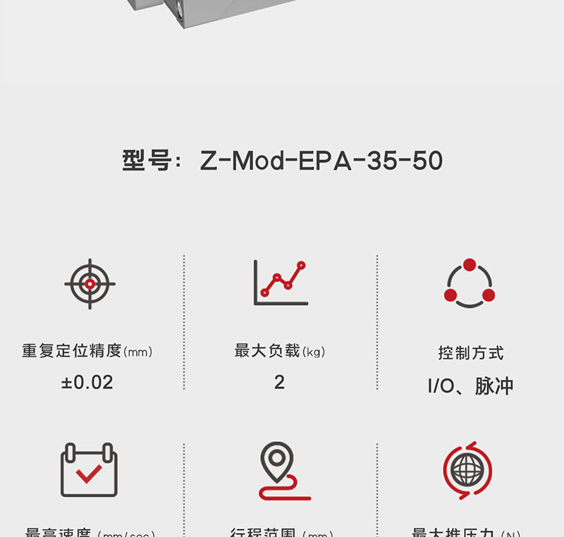 2023年1月7日 Lu, DongWu 智能電缸 0 Z-Mod-EPA-35-50 首頁 / 智能電缸 / Z-Mod-EPA-35-50 微型電動推桿 滑塊結(jié)構(gòu),抗傾覆力強 點擊觀看視頻 微型電動推桿 滑塊結(jié)構(gòu),抗傾覆力強 點擊觀看視頻 產(chǎn)品描述 型號參數(shù) 資料下載 產(chǎn)品描述 Z-Mod-EPA-35-50 核心參數(shù) 2mm 300N? 導程 最大推壓力 50mm ? ? ? ? ? ? ? ? ?3KG 行程 ? ? ? ? ? ? ? ? ? ? ? ? ? ? ? 重復定位精度 *線框尺寸圖 型號參數(shù) 說明項 參數(shù) 行程(mm) 50mm 50mm 導程(mm) 1mm 2mm 最大速度(mm/s) 65mm/s 130mm/s 最大推壓力(N) 300N 180N 最大負載質(zhì)量(kg) 水平:6kg/垂直:2kg 水平:3kg/垂直1kg 重復定位精度(mm) ±0.02mm ±0.02mm 力控精度 ±10% ±10% 推桿不旋轉(zhuǎn)精度 ±1.5° ±1.5° 負載允許力矩 MR:3.14NM MP:1.42NM MY:1.42NM MR:3.14NM MP:1.42NM MY:1.42NM 整機重量 0.6kg 0.6kg 尺寸規(guī)格 125*48*35mm 125*48*35mm 控制方式 I/O控制、485總線控制 適用控制器 Z-Mod-DCIC-4 工作電壓 DC24V±10% 額定電流 2.3A 峰值電流 6.9A 使用環(huán)境 IP40 防護等級 0-40℃,85%RH以下(無結(jié)霜) 資料下載 點擊下載產(chǎn)品手冊 點擊下載3D圖 點擊下載運動范圍圖 產(chǎn)品詳情 相關產(chǎn)品