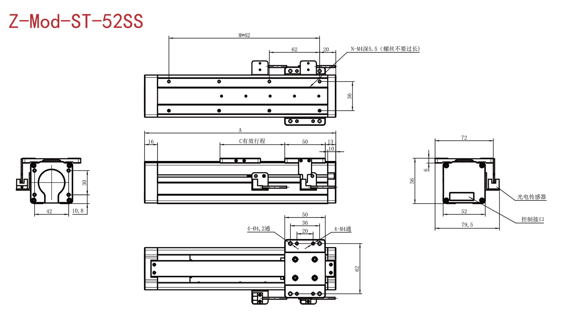 2022年1月25日 pruce 智能電缸 0 Z-Mod-ST-52SS 首頁 / 智能電缸 / Z-Mod-ST-52SS 最高速度:水平:180mm/s(1.5kg負載),垂直:120mm/s(2kg負載)最大可搬重量 水平/壁掛: 4kg垂直: 2kg額定推力:100N(水平)重復定位精度:±0.03mm 下載3D模型 下載產品手冊 最高速度:水平:180mm/s(1.5kg負載),垂直:120mm/s(2kg負載)最大可搬重量 水平/壁掛: 4kg垂直: 2kg額定推力:100N(水平)重復定位精度:±0.03mm 下載3D模型 下載產品手冊 產品描述 資料下載 產品描述 Z-Mod-ST-52SS 核心參數 HL42CM04 100N 步進電機規格 額定推力 100~400mm 4kg 行程范圍 最大可搬重量 *線框尺寸圖 規格參數 型號性能 電機功率/電壓 HL42CM04 (對標雷賽42CM04) 額定扭矩( N.m ) 參考曲線性能圖 導程(mm) 12 最高速度(mm/sec) 水平:180(1.5kg?負載) 垂直:120(2kg 負載) 額定加速 / / 最大可搬重量(水平/壁掛)(kg) 4 垂直 2 額定推力(N) 100 (水平) 行程范圍 100-400mm ( 100mm 間隔) 馬達額定轉速(RPM) 參考曲線性能圖 注: 1G=9800mm/sec2,最高速度只做參考,負載與速度成反比 通用規格 重復定位精度 ±0.03mm 驅動方式 T?型絲桿 動態容許力矩(注1) Ma:34.7N.m, Mb:34.7N.m, Mc:55.67N.m 負荷允許伸出長度 120mm 傳感器 / 感應器線纜長度 1.5m 基座材質 擠壓鋁型材,黑色光澤 安裝面積精度要求 平面度0.05mm以下 使用環境 0-40℃, 85%RH(不結霜) 注1:行走壽命為10000km時的數值 尺寸圖代號說明 ? 質量; 單位:mm 有效行程 100 200 300 400 A 236 336 436 536 C 100 200 300 400 ?M 3 4 6 7 N 8 ?10 14 16 ?質量(kg) 1.2 1.48 1.76 2.04 資料下載 點擊下載產品手冊 點擊下載3D圖 點擊下載運動范圍圖 Z-Mod-ST-52SS 核心參數 產品詳細參數 步進電機規格型號HL42CM04(對標雷賽42CM04)額定扭矩(N·m)參考曲線性能圖導程(mm)12最高速度(mm/sec)水平:180(1.5kg負載)垂直:120(2kg負載)額定加速度 (mm/sec2)//最大可搬重量 水平/壁掛(kg)4垂直2額定推力(N)100(水平)行程范圍(mm)100-400(100間隔)馬達額定轉速(RPM)參考曲線性能圖注:1G=9800mm/sec2 最高速度只做參考,負載與速度成反比。重復定位精度±0.03mm驅動方式T型絲杠動態容許力矩(注1)Ma:34.7N·m,Mb:34.7N·m,Mc:55.67N·m負荷允許伸出長度120mm傳感器/感應器線纜長度1.5m基座材質擠壓鋁型材,黑色光澤安裝面積精度要求平面度0.05mm以下使用環境0-40°C,85%RH](不結霜)注1:行走壽命為10000km時的數值 規格參數 型號性能電機功率/電壓HL42CM04 (對標雷賽42CM04)額定扭矩( N.m )參考曲線性能圖導程(mm)12最高速度(mm/sec)水平:180(1.5kg?負載)垂直:120(2kg 負載)額定加速//最大可搬重量(水平/壁掛)(kg)4垂直2額定推力(N)100 (水平)行程范圍100-400 ( 100 間隔)馬達額定轉速(RPM)參考曲線性能圖注: 1G=9800mm/sec2,最高速度只做參考,負載與速度成反比通用規格重復定位精度±0.03mm驅動方式T?型絲桿動態容許力矩(注1)Ma:34.7N.m, Mb:34.7N.m, Mc:55.67N.m負荷允許伸出長度120mm傳感器/感應器線纜長度1.5m基座材質擠壓鋁型材,黑色光澤安裝面積精度要求平面度0.05mm以下使用環境0-40℃, 85%RH(無結霜)注1:行走壽命為10000km時的數值尺寸圖代號說明 ? 質量; 單位:mm有效行程100200300400A236336436536C100200300400?M3467N8?101416?質量(kg)1.21.481.762.04 產品詳情 相關產品