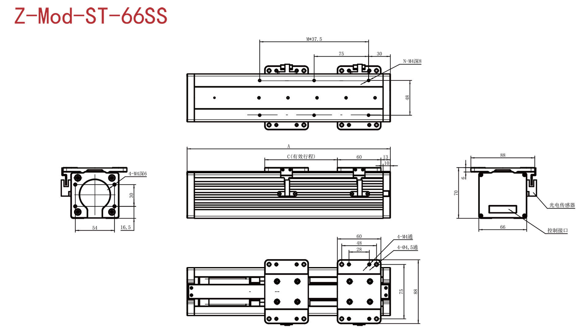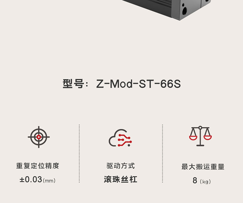 2022年2月9日 pruce 智能電缸 0 Z-Mod-ST-66SS 首頁 / 智能電缸 / Z-Mod-ST-66SS 最高速度:水平:180mm/s(3kg負(fù)載),垂直:120mm/s(3kg負(fù)載)最大可搬重量 水平/壁掛: 8kg垂直: 5kg額定推力:100N(水平)重復(fù)定位精度:±0.03mm 下載3D模型 下載產(chǎn)品手冊 最高速度:水平:180mm/s(3kg負(fù)載),垂直:120mm/s(3kg負(fù)載)最大可搬重量 水平/壁掛: 8kg垂直: 5kg額定推力:100N(水平)重復(fù)定位精度:±0.03mm 下載3D模型 下載產(chǎn)品手冊 產(chǎn)品描述 資料下載 產(chǎn)品描述 Z-Mod-ST-66SS 核心參數(shù) 25.4mm 100N (水平) 導(dǎo)程 額定推力 100~500mm 3KG 行程范圍 有效負(fù)載 *線框尺寸圖 規(guī)格參數(shù) 型號性能 電機(jī)功率/電壓 HL57CM13 (對標(biāo)雷賽57CM13) 額定扭矩( N.m ) 參考曲線性能圖 滾珠絲杠導(dǎo)程(mm) 25.4 最高速度(mm/sec) 水平:180(3kg?負(fù)載) 垂直:120(3kg 負(fù)載) 額定加速 / / 最大可搬重量(水平/壁掛)(kg) 8 垂直 5 額定推力(N) 100 (水平) 行程范圍 100-500 ( 100 間隔) 馬達(dá)額定轉(zhuǎn)速(RPM) 參考曲線性能圖 注: 1G=9800mm/sec2,最高速度只做參考,負(fù)載與速度成反比 通用規(guī)格 重復(fù)定位精度 ±0.03mm 驅(qū)動方式 滾珠絲杠 動態(tài)容許力矩(注1) Ma:58.5N.m, Mb:58.5N.m, Mc:104.7N.m 負(fù)荷允許伸出長度 150mm 傳感器 / 感應(yīng)器線纜長度 1.5m 基座材質(zhì) 擠壓鋁型材,黑色光澤 安裝面積精度要求 平面度0.05mm以下 使用環(huán)境 0-40℃, 85%RH(無結(jié)霜) 注1:行走壽命為10000km時的數(shù)值 尺寸圖代號說明 ? 質(zhì)量; 單位:mm 有效行程 100 200 300 400 500 A 280 380 480 580 680 C 100 200 300 400 500 ?M 2 4 5 7 8 N 6 ?10 12 16 18 ?質(zhì)量(kg) 2.7 3 3.7 4 4.7 資料下載 點(diǎn)擊下載產(chǎn)品手冊 點(diǎn)擊下載3D圖 點(diǎn)擊下載運(yùn)動范圍圖 Z-Mod-ST-66SS 核心參數(shù) 產(chǎn)品詳細(xì)參數(shù) 步進(jìn)電機(jī)規(guī)格型號HL57CM13(對標(biāo)雷賽57CM13)額定扭矩(N·m)參考曲線性能圖滾珠絲杠導(dǎo)程(mm)25.4最高速度(mm/sec)水平:180(3kg負(fù)載)垂直:120(3kg負(fù)載)額定加速度 (mm/sec2)//最大可搬重量 水平/壁掛(kg)8垂直5額定推力(N)100(水平)行程范圍(mm)100-500(100間隔)馬達(dá)額定轉(zhuǎn)速(RPM)參考曲線性能圖注:1G=9800mm/sec2 最高速度只做參考,負(fù)載與速度成反比。重復(fù)定位精度±0.03mm驅(qū)動方式滾珠絲杠動態(tài)容許力矩(注1)Ma:58.5N·m,Mb:58.5N·m,Mc:104.7N·m負(fù)荷允許伸出長度150mm傳感器/感應(yīng)器線纜長度1.5m基座材質(zhì)擠壓鋁型材,黑色光澤安裝面積精度要求平面度0.05mm以下使用環(huán)境0-40°C,85%RH](無結(jié)霜)注1:行走壽命為10000km時的數(shù)值 規(guī)格參數(shù) 型號性能電機(jī)功率/電壓HL57CM13 (對標(biāo)雷賽57CM13)額定扭矩( N.m )參考曲線性能圖滾珠絲杠導(dǎo)程(mm)25.4最高速度(mm/sec)水平:180(3kg?負(fù)載)垂直:120(3kg 負(fù)載)額定加速//最大可搬重量(水平/壁掛)(kg)8垂直5額定推力(N)100 (水平)行程范圍100-500 ( 100 間隔)馬達(dá)額定轉(zhuǎn)速(RPM)參考曲線性能圖注: 1G=9800mm/sec2,最高速度只做參考,負(fù)載與速度成反比通用規(guī)格重復(fù)定位精度±0.03mm驅(qū)動方式滾珠絲杠動態(tài)容許力矩(注1)Ma:58.5N.m, Mb:58.5N.m, Mc:104.7N.m負(fù)荷允許伸出長度150mm傳感器/感應(yīng)器線纜長度1.5m基座材質(zhì)擠壓鋁型材,黑色光澤安裝面積精度要求平面度0.05mm以下使用環(huán)境0-40℃, 85%RH(無結(jié)霜)注1:行走壽命為10000km時的數(shù)值尺寸圖代號說明 ? 質(zhì)量; 單位:mm有效行程100200300400500A280380480580680C100200300400500?M24578N6?10121618?質(zhì)量(kg)2.733.744.7 產(chǎn)品詳情 相關(guān)產(chǎn)品